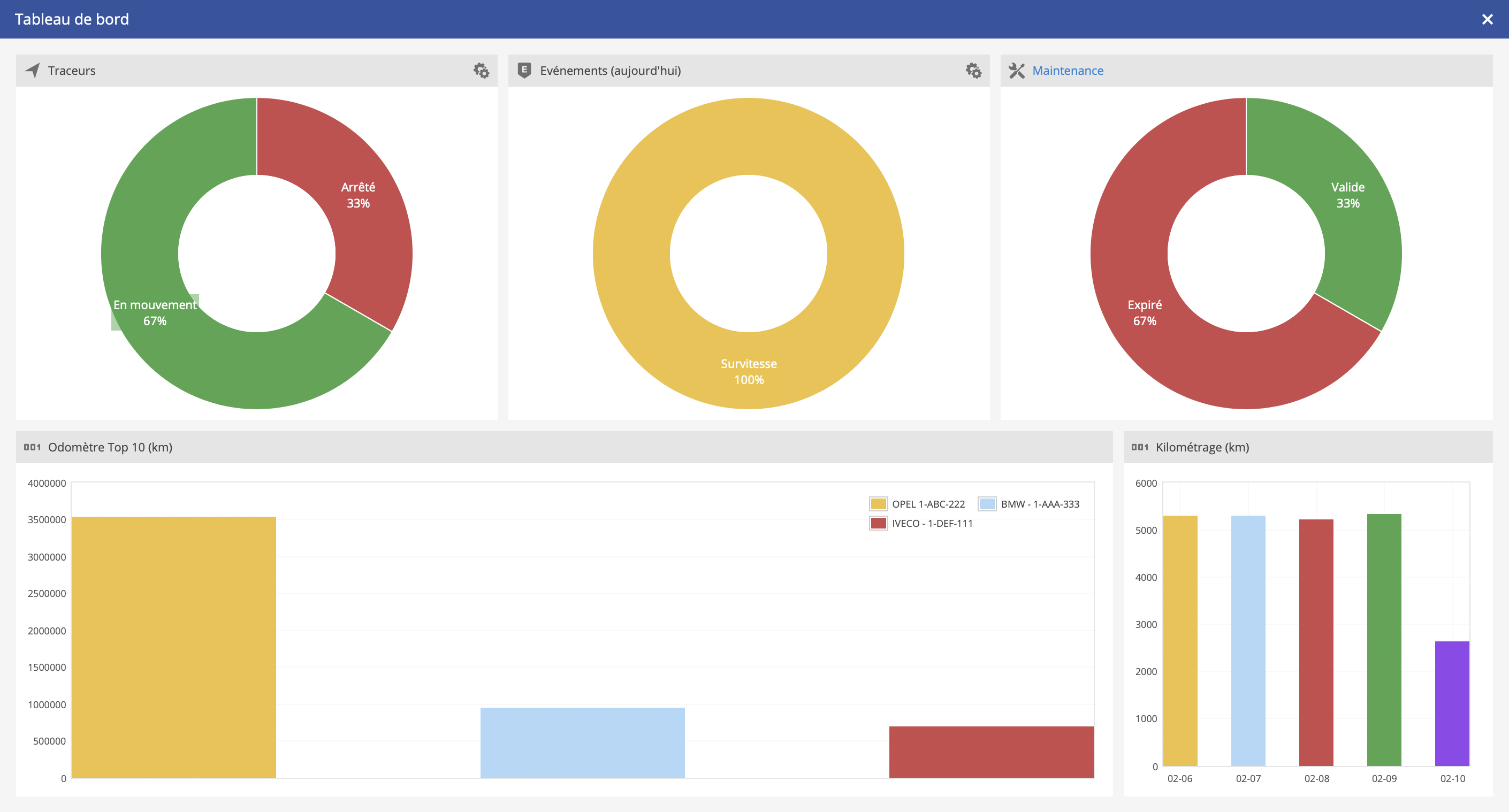 Le tableau de bord est un outil efficace pour surveiller les objets, les événements, la maintenance, les tâches et le kilométrage.