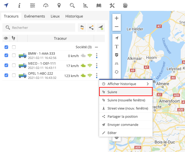 Ce panneau permet d’afficher un traceur sur la carte, voir son historique et envoyer des commandes. Cliquez sur un traceur pour afficher sa position sur la carte.