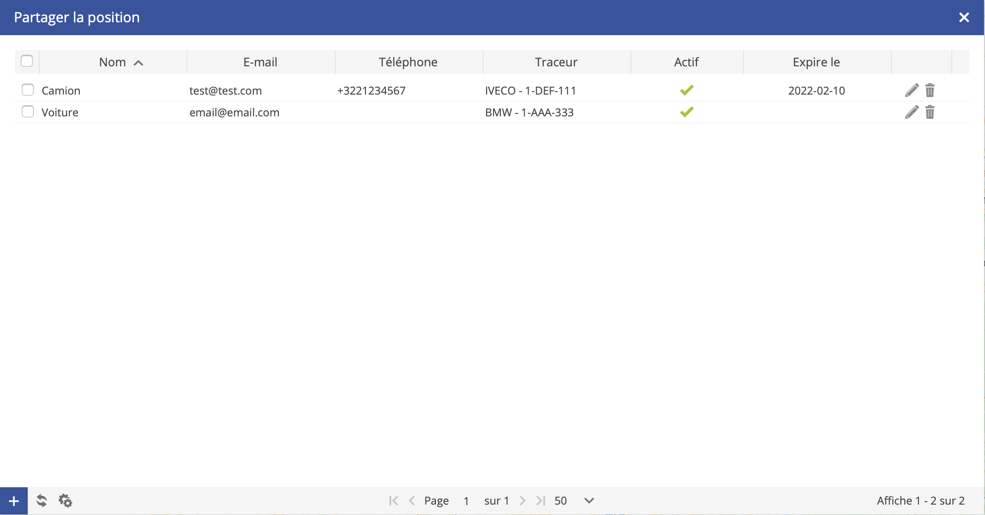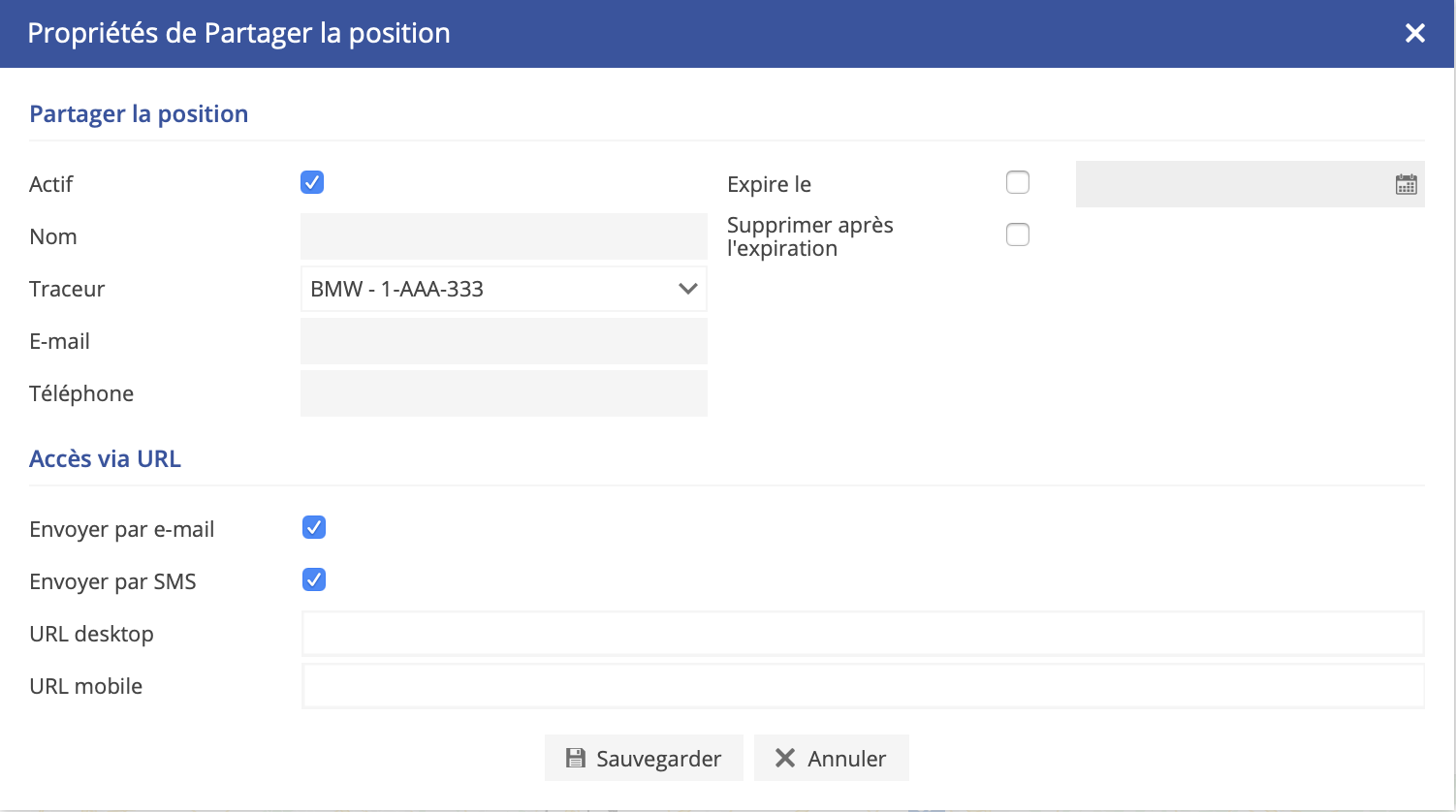 “Partage de position” permet d’envoyer le lien du traceur par e-mail ou SMS. Le lien ouvrira la carte avec l’emplacement en temps réel du traceur, sans avoir besoin de se connecter avec un login et mot de passe.